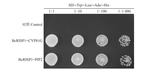诱饵载体pGBK-BcRISP1分别与含有CYP81G和PIP2互作基因的质粒共转化酵母菌株AH109,然后在不同浓度梯度的SD/-Trp/-Leu/-Ade/-His缺陷型固体培养基上培养,结果(图 6)发现各组酵母细胞均能生长。