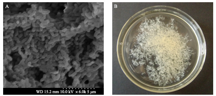 | 图 1 菌株SS1的细胞形态(A)及其在液体培养基中形成的絮体形态(B) Fig. 1 Morphology of the cells(A)of strain SS1 and the flocs formed in liquid medium(B) |