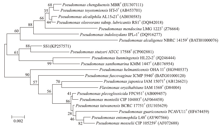 将新鲜的SS1菌体直接加入PCR扩增体系,以细菌16S rDNA基因通用引物进行PCR扩增并进行测序,得到1 558 bp的片段,将测序结果提交至GenBank(登录号为KP257571),与GenBank中其他菌株的16S rDNA进行相似性比较,并构建系统发育树(图 3)。结果显示:SS1菌株与Pseudomonas属中各种的相似度为97%~99%,与Pseudomonas stutzeri的相似性最高达99%,按照目前普遍接受的聚类标准,当一个分离菌株同参考菌株16S rDNA同源性大于97%时,可归为相同的属,因此根据上述16S rDNA序列同源性比对结果,将菌株SS1初步鉴定为假单胞菌属的一个种,并命名为Pseudomonas sp.SS1。