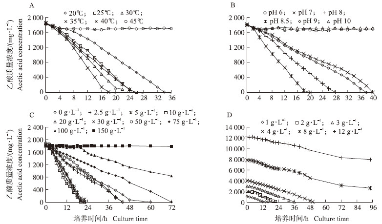 1.5 分离菌株的降解特性研究通过一系列摇瓶试验研究温度、起始pH、盐浓度及底物浓度等因素对分离菌株降解性能的影响,各参 数的试验范围分别为温度20~45 ℃,初始pH 6~10,NaCl质量浓度0~150g·L-1,底物质量浓度1~12g·L-1。试验在500 mL三角摇瓶中进行,各三角瓶均含有180 mL乙酸培养基和20 mL种子液,除温度试验外均置于30 ℃摇床中培养,培养过程中每隔2 h取样2 mL,离心沉淀菌体,上清液用于乙酸质量浓度的测定。