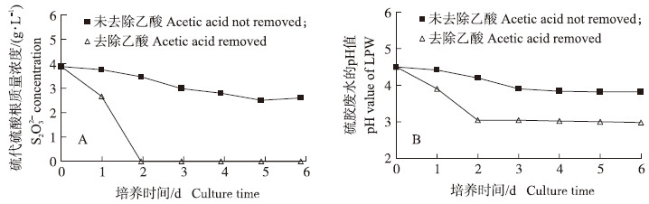 1.6 分离菌株在硫胶废水中的降解性能及其对硫代硫酸盐生物氧化的影响向500 mL三角瓶中加入180 mL硫胶废水,接入6 g絮凝细菌的湿菌体(折合菌体干质量为1.6g·L-1),混匀后置于30 ℃、170r·min-1摇床培养,定期取样测定硫胶废水中乙酸的质量浓度,计算降解速率。待乙酸完全降解后将培养液过滤除去细菌絮体,取135 mL滤液加入500 mL三角瓶,另取1个500 mL三角瓶加入135 mL硫胶废水原水作为对照,然后接入15 mL活化培养的Halothiobacillus sp.TX菌株,并将混合液的起始pH调节至4.5,置于30 ℃、170r·min-1摇床培养,定时取样测定培养液pH值及硫代硫酸根的质量浓度,比较硫代硫酸盐的降解速率。