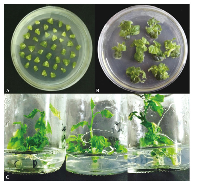| 图 2 黄瓜遗传转化的主要阶段 Fig. 2 Major steps of the procedure of cucumber transformation A.预培养Pre-culture;B.子叶节再生Cotyledon node regeneration;C.诱导生根Rooting culture |