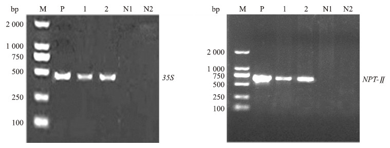 1.2.4 T0代和T1代植株PCR检测以表达载体上的特有的CaMV 35 S和NPT- Ⅱ 基因序列作为检测转化植株的报告基因,根据其序列设计特异引物,引物序列如下: 35 S-F:5′-ACAGAACTCGCCGTAAAG-3′; 35 S-R:5′-AGTGGGATTGTGCGTCAT-3′;NPT- Ⅱ -F:5′-CTGGGCACAACAGACAATC-3′;NPT- Ⅱ -R:5′TACCGTAAAGCACGAGGAA-3′。PCR引物由英潍捷基(上海)贸易有限公司合成。