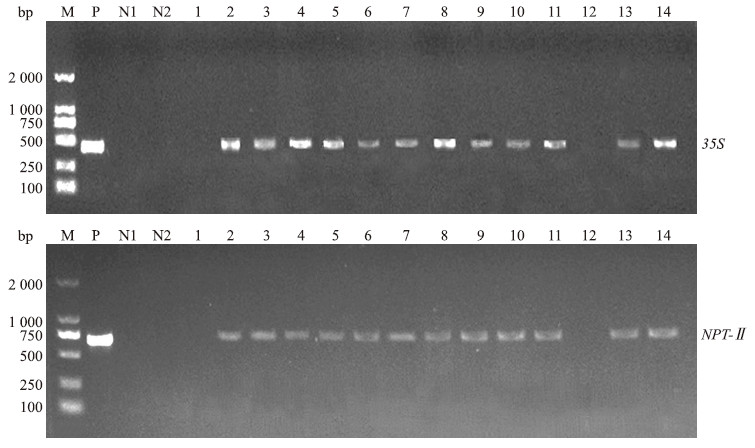 凝胶电泳结果(图 3)显示:阳性对照重组质粒和抗性植株14S1、14S2均可扩增出 35 S和NPT- Ⅱ 片段,长度分别为440和733 bp,而阴性对照水和非转化植株则不能扩增出 35 S和NPT- Ⅱ 片段,初步证明pROK2重组质粒已成功整合到14S1、14S2两个株系的基因组中。