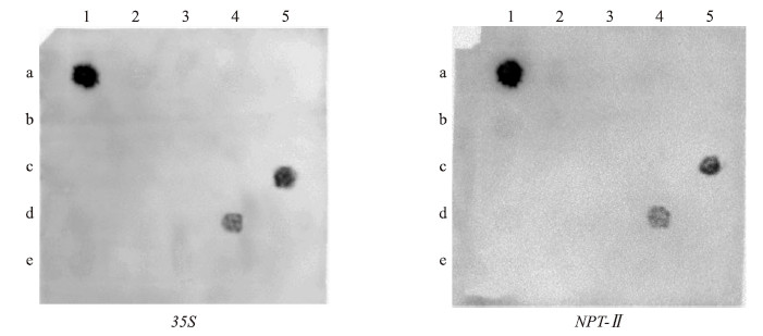 1.2.5 T1代植株斑点杂交检测采用CTAB法提取14S1自交后代植株叶片基因组大量DNA。以Dig标记的 35 S和NPT- Ⅱ 引物PCR扩增条带作为探针。将5 μL高温变性的DNA样品(2~10 μg)点于尼龙膜上,重组质粒为阳性对照,非转化植株为阴性对照,紫外交联4 min以固定样品。探针标记、预杂交、杂交和显色等步骤按照Roche地高辛试剂盒说明书进行。