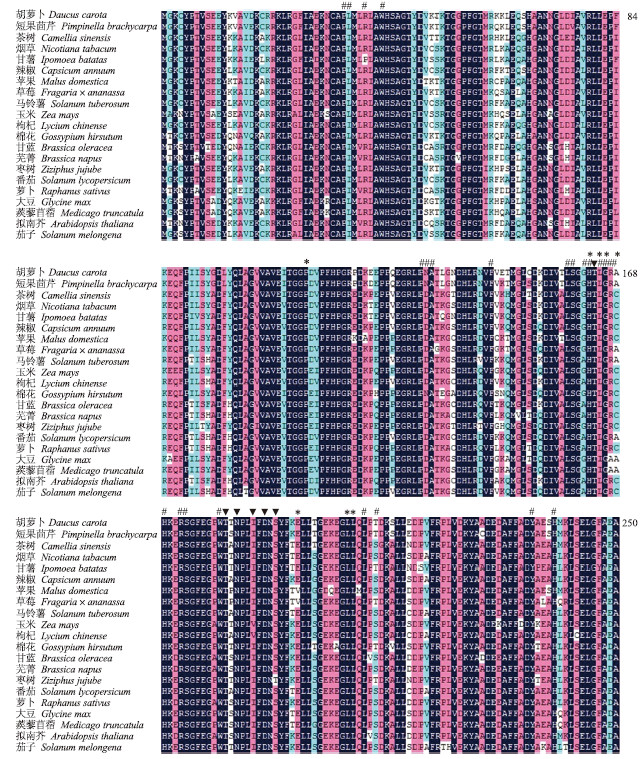 | 图 2 胡萝卜APX与其他物种APX氨基酸序列保守区域的多重比较 Fig. 2 Alignment of conserved domains of APX from carrot and other plant species #亚铁血红素结合位点 Heme binding site;*底物结合位点 Substrate binding site;▼K+结合位点 K+ binding site |