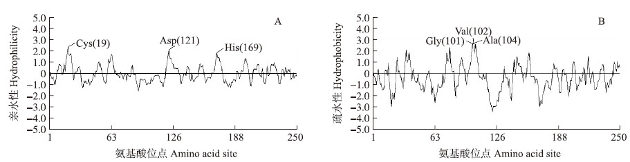 | 图 3 预测的胡萝卜DcAPX氨基酸序列的亲水性和疏水性 Fig. 3 Predicted hydrophilicity and hydrophobicity of deduced amino acid sequence of DcAPX from carrot |