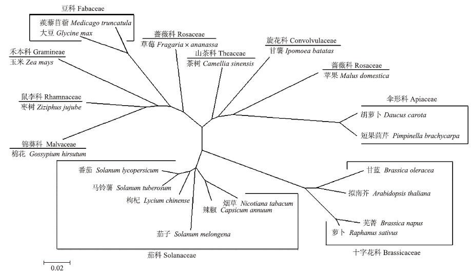 选取21个物种,分析胡萝卜DcAPX与这些物种中APX的进化关系。从构建的同源进化树可以看出:胡萝卜DcAPX与短果茴芹的进化最为相似;茄科当中番茄、马铃薯、枸杞、茄子、辣椒、烟草的APX同属一个分支;十字花科中甘蓝、拟南芥、芜菁、萝卜的APX同属于一个分支;豆科中蒺藜苜蓿、大豆的APX同属于一个分支(图 4)。