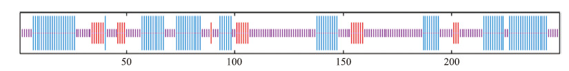 蓝色:α-螺旋;红色:延伸主链;紫色:无规则卷曲 Blue:Alpha helix;Red:Extended strand;Purple:Random coil |