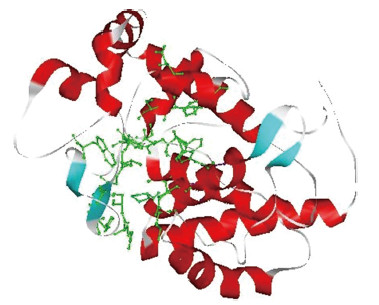 | 图 6 胡萝卜DcAPX三级结构 Fig. 6 The tertiary structural model of DcAPX from carrot 绿色表示亚铁血红素结合位点。Green represents heme binding site. |