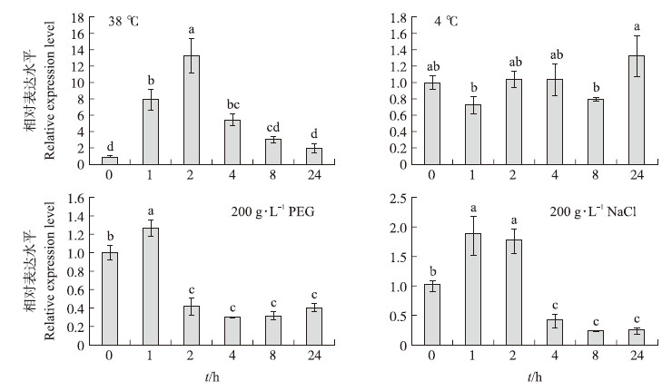 由图 8可见:‘黑田五寸’中DcAPX基因在受到外界高温(38 ℃)、低温(4 ℃)、干旱(200 g· L-1 PEG)和盐害(200 g· L-1 NaCl)逆境胁迫后,其表达量较对照条件下有显著变化,高温处理后的基因表达变化最大。高温可以显著诱导‘黑田五寸’DcAPX基因的表达,并在2 h后达到最大值,之后随着时间推移,表达逐渐减弱。干旱处理后1 h表达量升至最大,随后减弱,并趋于稳定。盐害处理条件下,于1~2 h期间表达最大,随后减弱,并趋于稳定。低温处理条件下,DcAPX基因表达量在前期较稳定,但在24 h后显著上升。盐胁迫下,DcAPX基因表达呈现先升高后降低的趋势,其表达量也在1 h时达到最大(图 8)。