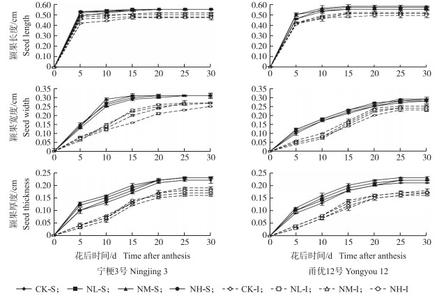 1.3 测定项目及方法 1.3.1 颖果长、宽、厚测定参照朱庆森等[14]方法,在抽穗期选择同日抽穗开花、生长整齐的单茎挂牌标记,每小区挂牌300个。自开花至花后30 d每5 d取1次样,每次取20个挂牌单茎。每个稻穗分为强势粒(S)、弱势粒(I)两部分,强势粒为第1、2天开花的籽粒,弱势粒为最后2 d开花的籽粒,每处理籽粒取下后于105 ℃烘箱杀青30 min,然后80 ℃烘干至恒质量,取出强、弱势粒各30粒,采用数显游标卡尺量出每一粒长度、宽度和厚度。