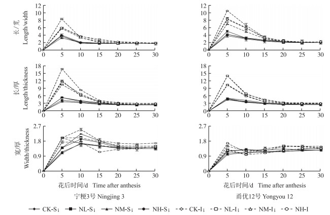从图 2可见:氮素穗肥用量对2个超级稻品种颖果长/宽、长/厚的影响在花后5 d最显著,各处理弱势粒长/宽、长/厚均高于强势粒,CK处理弱势粒颖果长/宽、长/厚变化最大,随着水稻颖果的生长,处理间和粒位间差异逐渐减小,20 d后强、弱势粒长/宽、长/厚比无明显差异。不同氮素穗肥用量下2个超级稻品种颖果宽/厚变化较复杂,2个品种各处理强、弱势粒颖果宽/厚以CK处理弱势粒最大,NL处理弱势粒次之,出现宽大厚小,籽粒呈现“扁”形,充实不良。