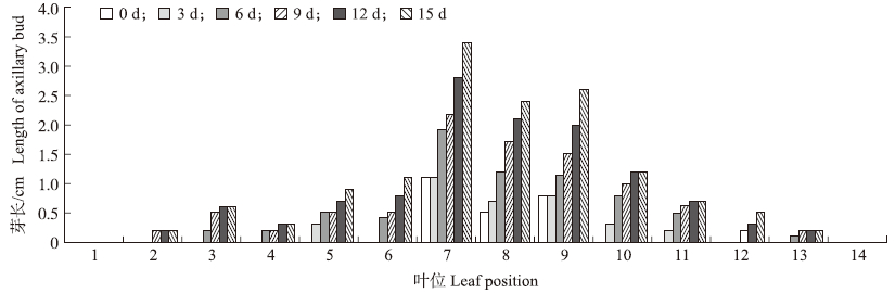 2 结果与分析 2.1 外源GR24对不结球白菜‘如皋毛菜’腋芽生长的影响 2.1.1 不结球白菜‘如皋毛菜’腋芽生长的动态调查‘如皋毛菜’长到约8片真叶时,腋芽形成,几乎每个叶片的叶腋内都有腋芽长出;长到11~12片真叶时,腋芽开始萌动。由图 1可知:当腋芽长度大于0.2 cm时,腋芽开始迅速伸长,而小于0.2 cm的腋芽,处于基本不伸长或休眠状态,因而将大于0.2 cm的腋芽定义为活动芽,小于或等于0.2 cm的腋芽定义为休眠芽。位于中间叶位的腋芽最先开始萌动,而最里面和最外面的腋芽生长比较晚或基本不生长。