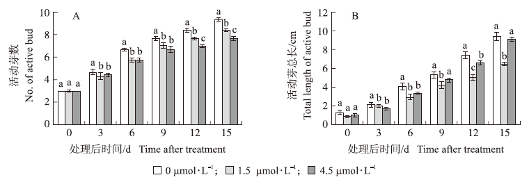 向营养液中加入GR24母液,使其终浓度分别为0、1.5和4.5 μmol·L-1,对照加入与处理等量的丙酮,每3 d换1次营养液并加入相应量的GR24母液。分别于处理后0、3、6、9、12和15 d统计单株活动芽的个数,并用直尺测量活动芽的长度,每处理10株,3次重复。