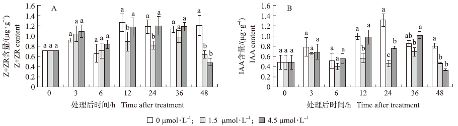 图 3 外源GR24对不结球白菜叶腋内Z+ZR(A)和IAA(B)含量的影响 Fig. 3 Effects of exogenous GR24 on the contents of Z+ZR(A)and IAA(B)in non-heading Chinese cabbage leaf axil |