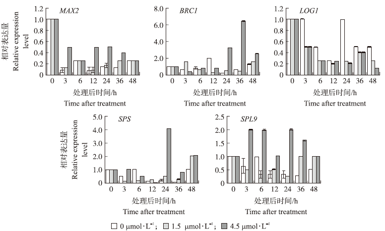 4.5 μmol·L-1 GR24处理后6 h,SPS基因的表达量降低,12 h时降至最低,24 h时迅速升至最高,之后回降;1.5 μmol·L-1 GR24处理后3 h,SPS表达量迅速降至最低,24 h时开始回升,并至48 h时升到最高;对照的SPS表达量变化趋势与1.5 μmol·L-1 GR24处理基本一致(图 4)。外源GR24处理后24 h开始,SPS表达量较对照升高,且4.5 μmol·L-1 GR24处理比1.5 μmol·L-1 GR24处理升高的更为明显。4.5 μmol·L-1 GR24处理后3 h,SPL 9基因的表达量迅速升高,12 h时回降,之后又升高,24~48 h又逐渐下降;1.5 μmol·L-1 GR24处理后,SPL 9表达量0~6 h呈下降趋势,6~24 h变化不大,36 h时又开始升高,之后趋于稳定;对照的SPL 9表达量12 h时开始下降,之后趋于平稳。4.5 μmol·L-1的GR24处理后3 h,SPL 9表达量较对照有明显的升高,1.5 μmol·L-1 GR24处理后12 h,SPL 9表达量较对照升高,且高浓度的升高作用更为明显。总体来看,高浓度的GR24处理比低浓度的GR24处理对SPL 9基因表达量的影响更大。