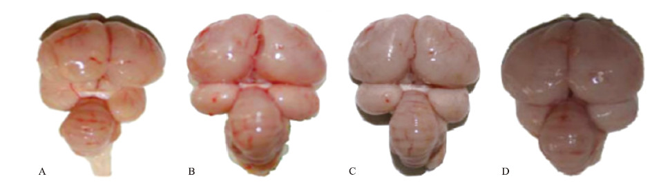2.2 脑组织剖检病理变化由图 1可见:雏鸡屠宰剖检后,迅速取出完整的脑部组织,可见对照组雏鸡脑组织无明显病理变化,颜色正常;而试验组鸡脑组织出现不同程度的肿胀和出血点,且随着染毒剂量的增加,呈现脑组织颜色逐渐变暗的现象。