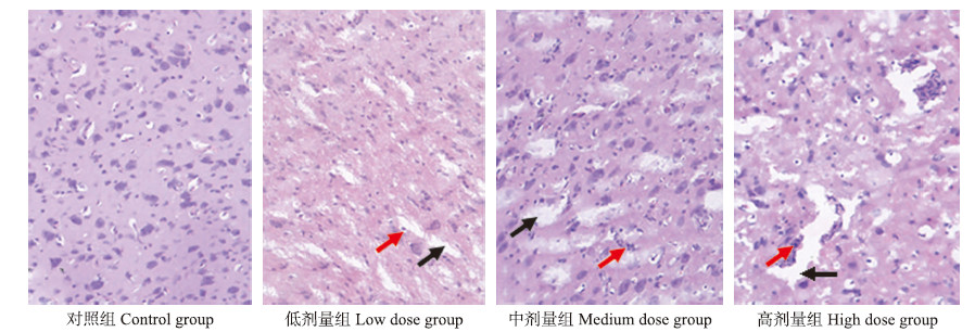 由图 2可见:对照组(图 2-A)雏鸡脑组织形态结构正常,无明显病理变化;低剂量组(图 2-B)雏鸡脑细胞间隙增大,出现轻微的脑水肿现象,部分神经细胞周围的小胶质细胞增多;中剂量组(图 2-C)雏鸡脑细胞间隙增大,出现明显的脑水肿和非化脓性脑炎现象,神经细胞周围的小胶质细胞开始吞噬神经细胞;高剂量组(图 2-D)雏鸡脑细胞变得稀疏,出现明显的脑水肿和典型的非化脓性脑炎现象,并开始出现明显的噬神经现象,伴随有部分神经纤维断裂。