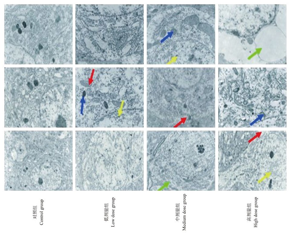 由图 3可见:对照组雏鸡大脑皮质神经元呈现正常超微结构影像,神经元细胞膜、核膜完整,染色质分布均匀,线粒体和内质网形态、结构及周围突起正常。低剂量组脑神经元胞体出现轻度变性,主要表现为神经元细胞膜、核膜完整,染色质分布均匀,部分线粒体出现空泡变性,粗面内质网轻度扩展、断裂,核糖体减少,溶酶体体积增大、数量增多。中剂量组脑神经元胞体出现严重变性,主要表现为神经元细胞膜、核膜完整,胞体肿胀,细胞核正常,胞浆肿胀,粗面内质网扩展、断裂、减少,核糖体减少,线粒体空泡变性、减少,溶酶体体积增大、数量增多。高剂量组脑神经元胞体出现水样变性甚至坏死,主要表现为胞体肿胀,部分神经元细胞膜、核膜被破坏,胞浆肿胀严重,溶酶体体积增大、数量增多,线粒体肿胀、嵴间隙增宽,部分细胞器几乎消失。