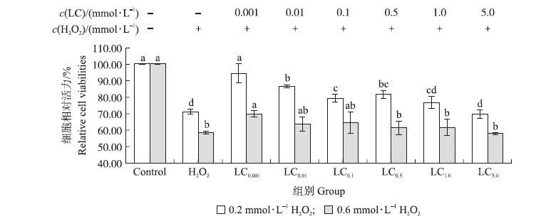 1.2.2 细胞活力的测定取生长对数期FHM细胞,用1 g · L-1胰蛋白酶消化制备细胞悬液,接种于96孔细胞培养板,接种数量为每孔2.5×104个,置25 ℃、5% CO2恒温培养箱中培养24 h。将细胞分为对照组、氧化应激组(用0.2和0.6 mmol · L-1的H2O2刺激细胞1 h)、LC添加组(不同浓度LC作用6 h后,H2O2刺激细胞1 h)。弃旧培养基,PBS清洗后,对照组和氧化应激组更换为无血清M199,LC组添加含有不同浓度LC(0.001、0.01、0.1、0.5、1.0和5.0 mmol · L-1)的无血清M199进行预处理,分别于6 h后取出培养板,对照组更换为无血清M199,氧化应激组与各LC添加组均用含0.2和0.6 mmol · L-1 H2O2的无血清M199刺激细胞,每处理6复孔,每孔100 μL,置25 ℃、5% CO2恒温培养箱中孵育,用MTT法测定细胞活力,具体步骤参考王秋举等[8]方法。
