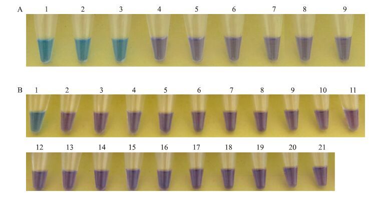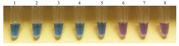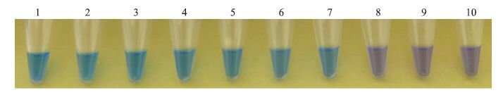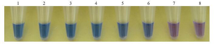 1.5 扩增结果判断方法以HNB(羟基萘酚蓝)为显色指示剂,在反应前加入,每个反应体系中加入HNB(2.4 mmol·L-1)2 μL,LAMP反应结束后,通过肉眼观察指示剂颜色变化判定扩增结果,阳性为天蓝色,阴性为紫色。