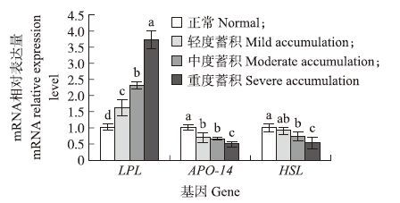 Fig. 3 Relative expression levels of LPL,APO-14 and HSLgene in Ctenopharyngodon idella hepatopancreasewith different degree of lipid accumulation