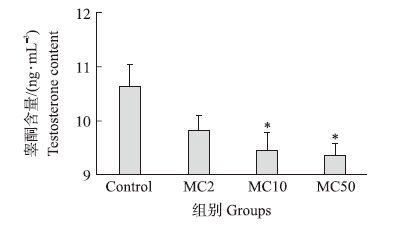 2.2 三聚氰胺与三聚氰酸混合物对小鼠血清睾酮含量的影响由图 1可见:小鼠经混合物处理后血清睾酮含量均低于对照组小鼠,且血清睾酮含量与MC剂量呈负相关,其中MC10和MC50组小鼠血清睾酮含量明显低于对照组(P<0.05)。