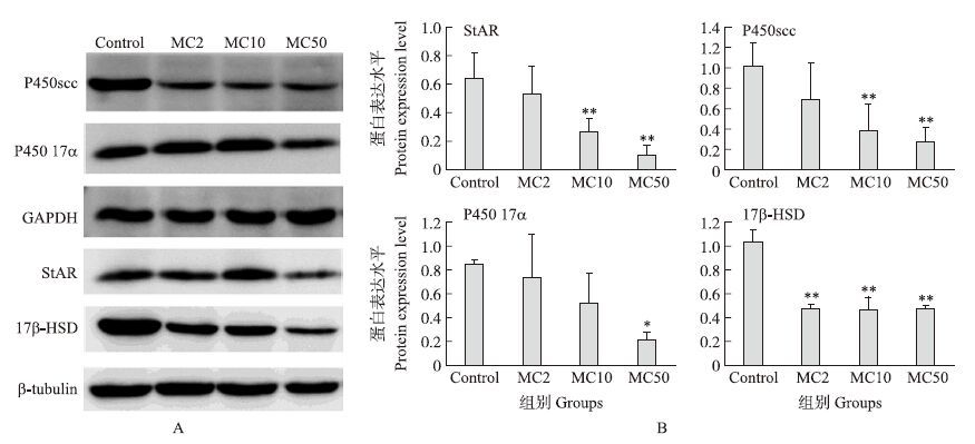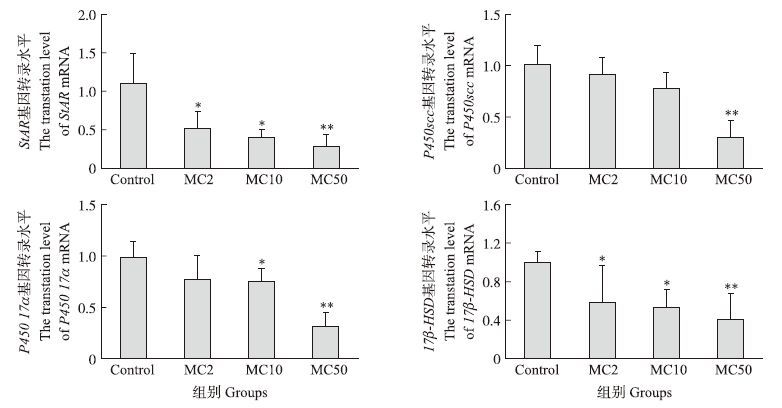 由图 2可知:MC处理组StAR mRNA表达量均低于对照组,其中MC2、MC10组StAR mRNA表达量与对照组差异显著(P<0.05),MC50组差异极显著(P<0.01);MC50组P450scc mRNA表达量极显著低于对照组(P<0.01);MC处理组P450 17α mRNA表达量均低于对照组,且MC10组与对照组差异显著(P<0.05),MC50组与对照组差异极显著(P<0.01);MC组17β-HSD mRNA表达量均降低,其中 MC2组、MC10组与对照组差异显著(P<0.05),MC50组与对照组差异极显著(P<0.01)。