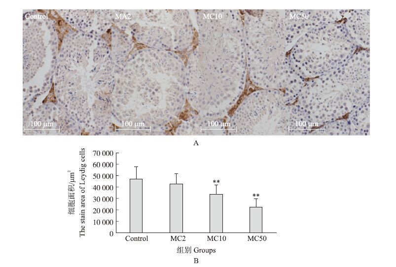 如图 4所示:MC处理组小鼠睾丸间质细胞数量均低于对照组,MC10和MC50组与对照组差异极显著(P<0.01),且小鼠睾丸间质细胞数量与混合物的浓度呈负相关。