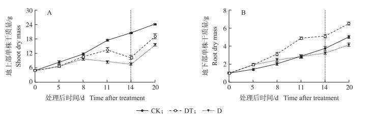 2 结果与分析 2.1 TDM和干旱胁迫对蕾薹期油菜生物量的影响如图 1所示, 随干旱胁迫时间的延长油菜地上部增长缓慢。在干旱11 d时, 干旱处理的地上部干质量仅是对照的60.74%;而干旱处理后喷施TDM能缓解干旱胁迫, DT处理地上部干质量较干旱处理增加57.42%。同时, 干旱胁迫也延缓了后期油菜地下部生长。干旱14 d时, 干旱处理的地下部干质量较对照下降13.83%;干旱处理后喷施TDM显著提高地下部干质量, DT处理的地下部干质量较干旱处理增加36.72%。