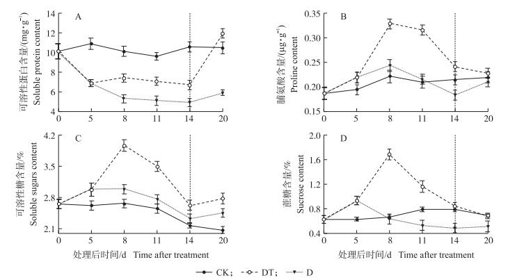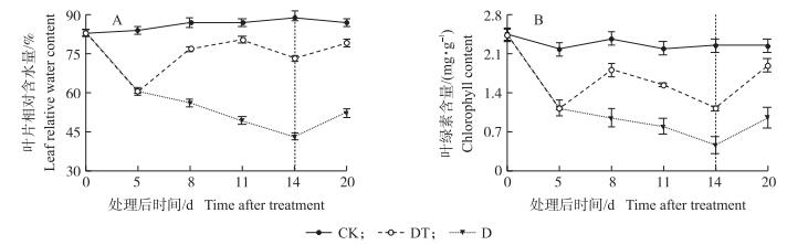 1)图中竖线为干旱和复水的分界线。Vertical line is the dividing line of the drought and re-watering. 2)CK:正常对照Control; DT:干旱+TDM处理Drought+TDM; D:干旱处理Drought. The same as follows. |
