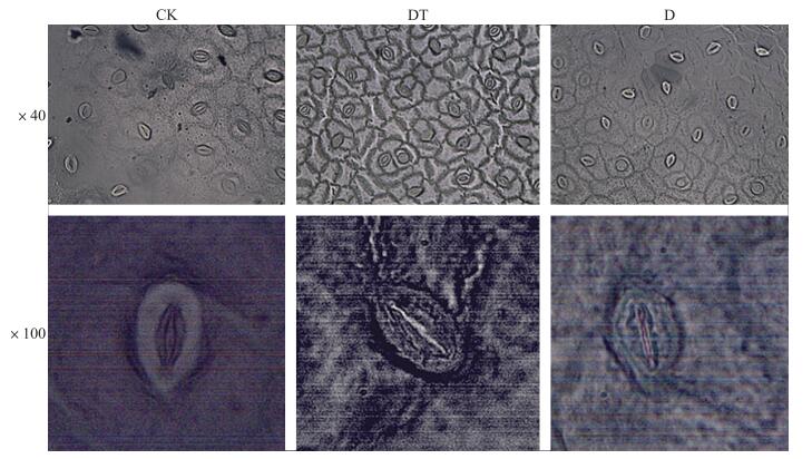 从图 3和表 1可见, 干旱胁迫导致单个气孔减小, 张开的气孔数量显著下降, 气孔关闭比例明显增加, 干旱处理气孔关闭比例是对照的2.8倍; 干旱处理后喷施TDM促进了气孔的开放, 使得单个气孔长度略有增加, 而气孔宽度显著增加, 同等视野下张开的气孔数量显著增加, DT处理张开的气孔数量较干旱处理增加51.85%。