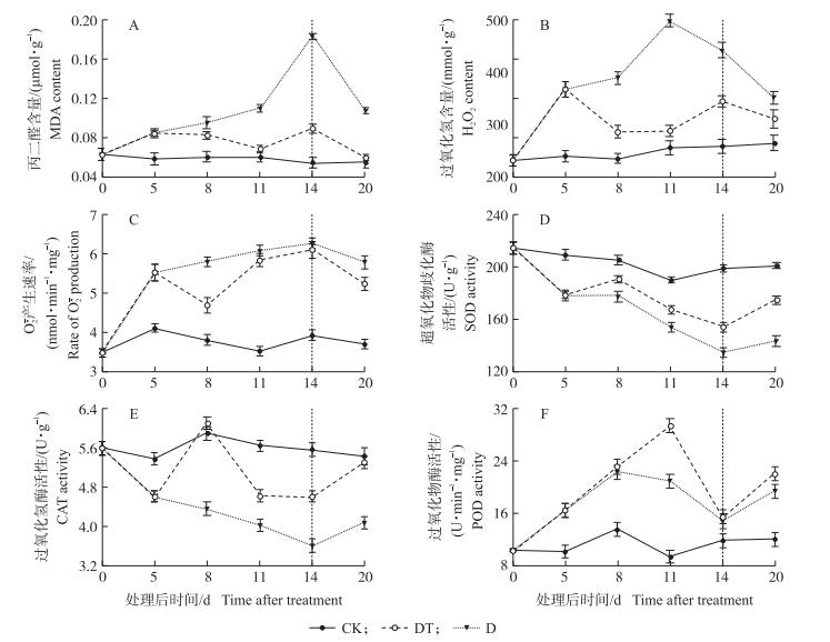 1.2 试验设计试验于2013年10月17日至2014年6月4日在南京农业大学牌楼试验站进行。试验用盆高20 cm、内径25.5 cm, 每盆装土8 kg, 基肥为尿素、磷酸二氢钾, 施用量分别为8 g和4.6 g, 有机肥0.4 kg(有机质≥45%, 氮磷钾≥5%)。每盆播种20粒, 3叶期定苗, 每盆留长势一致的苗3株。试验共设3个处理:正常对照(CK)、干旱处理(D)和干旱+TDM处理(DT), 每个处理设3个重复。在油菜蕾薹期进行干旱处理, 通过称重法控制土壤相对含水量, 正常对照处理土壤相对含水量保持在75%, 干旱处理土壤相对含水量为45%。在干旱5 d时, 干旱+TDM处理喷施质量浓度为240 mg · L-1的TDM(TDM质量浓度根据预试验结果确定), 干旱处理与正常对照喷施等量蒸馏水, 喷施至叶片正反面均有药剂滴下为止(喷施量大约400 mL)。2个干旱处理持续干旱14 d后复水, 此后各处理进行同样水分管理。分别在干旱开始后5、8 d(TDM处理3 d)、11 d(TDM处理6 d)、14 d(TDM处理9 d)及复水后6 d(干旱开始后20 d)取样。取样时间为09:00—11:00, 所取植株按照根、茎、叶分样, 称取鲜质量后, 烘干至恒质量并称取干物质质量。同时取最上面3片完全展开叶, 经液氮处理后-40 ℃冷冻存放, 用于生理指标的测定。