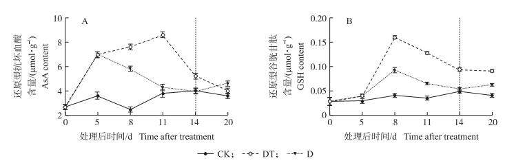 2.5.4 对叶片抗坏血酸及谷胱甘肽含量的影响如图 6所示, 干旱胁迫期间AsA含量呈单峰曲线, 峰值出现在干旱胁迫5 d, 较对照增加48.29%。干旱处理后喷施TDM显著减缓干旱后期AsA含量的降低, 使DT处理的AsA含量处于较高水平。GSH含量随干旱时间延长呈先升后降的趋势, 峰值出现在干旱处理8 d, 与对照相比增加55.71%。干旱处理后喷施TDM, GSH含量迅速提高, 其含量在TDM处理3 d时较干旱处理提高42.45%。