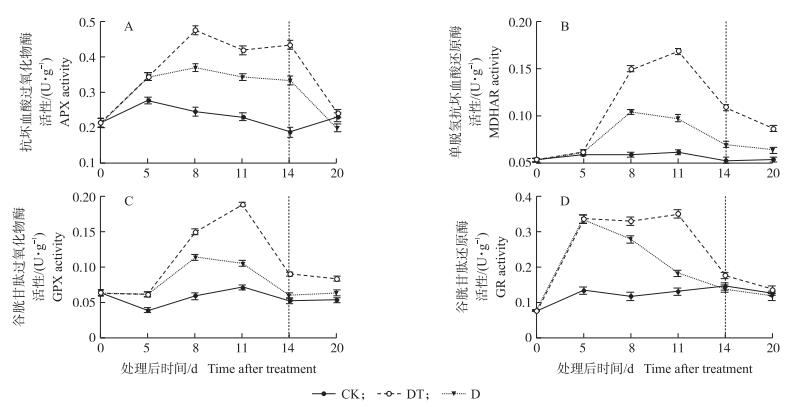 如图 7所示, 长期干旱胁迫下, APX、MDHAR、GPX、GR活性出现先升高后降低的趋势。在干旱8 d时, APX、MDHAR、GPX活性达到峰值, 比对照分别高出33.51%、42.87%、47.79%, 而GR活性在干旱5 d时达到峰值, 较对照酶活性提高59.92%。干旱处理后喷施TDM明显提高APX、MDHAR、GPX、GR活性, 且延缓后期其活性的降低:DT处理的APX活性在喷施TDM 3 d时较干旱处理提高22.35%(图 7-A); MDHAR活性在喷施TDM 6 d时较干旱处理提高41.89%(图 7-B); GPX活性在喷施TDM 6 d时较干旱处理提高62.13%(图 7-C); 在喷施TDM 3、6、9 d时, DT处理的GR活性较干旱处理分别提高15.67%、47.92%、21.56%(图 7-D)。