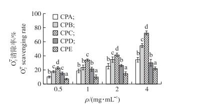 2 结果与分析 2.1 金华火腿粗肽液的分离纯化本试验采用葡聚糖凝胶层析法, 根据分子质量大小的不同对金华火腿粗肽液进行初步分离, 最终将金华火腿粗肽液分为5个组分(CPA、CPB、CPC、CPD和CPE)。如图 1所示:组分A的保留时间最短, 代表其分子质量最大, 而组分E的保留时间最长, 代表其分子质量最小。由图 2可以看出:5个组分清除超氧阴离子自由基的能力随着质量浓度的增大逐渐增加, 并存在明显的剂量效应关系。在质量浓度为4 mg·mL-1时, 组分CPC的清除能力达到了72.89%, 接着是组分CPB(55.98%)、组分CPA(34.33%)、组分CPD(30.13%)和组分CPE(21.03%)。综上所述, 本研究选取清除自由基能力最高的组分CPC进行下一步试验。