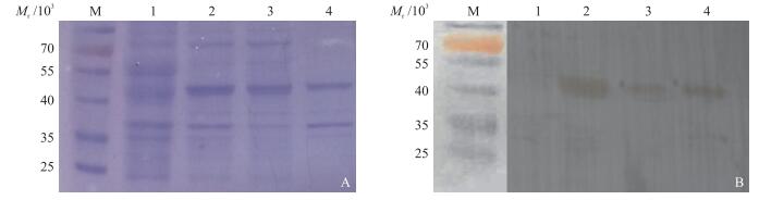 图 1 SDS-PAGE (A) 和Western blot (B) 分析荧光抗体的可溶性 Figure 1 VHH solubility identification by SDS-PAGE (A) and Western blot (B) M.蛋白分子质量标准品; 1.空载体全菌; 2.诱导后全菌; 3.诱导菌破碎后上清液; 4.诱导菌破碎后沉淀 M.Molecular size markers; 1.Whole bacterium pET32a/BL21 after IPTG-induced; 2.Whole bacterium pET-VHH-EGFP/BL21 after IPTG-induced; 3-4.Supernatant, inclusion body of pET-VHH-EGFP/BL21 with IPTG induction after high pressure crushing |