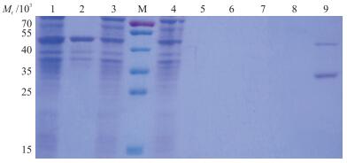 1.3.3 Western-blot鉴定取1.3.2处理的样品进行120 g·L-1 SDS-PAGE电泳, 通过半干转转印仪将蛋白条带转印到PVDF膜上; 转印后的PVDF膜用5%脱脂乳于37 ℃封闭1 h, 后弃去脱脂乳并用TBST漂洗10 min。用含有2% BSA TBST溶液稀释His单抗 (1:5 000), 于37 ℃孵育PVDF膜1 h, 随后用TBST充分漂洗5次, 每次洗涤8 min, 再用含2% BSA的TBST缓冲液稀释HRP标记的羊抗鼠二抗 (1:10 000), 37 ℃孵育1 h, TBST缓冲液充分漂洗5次, 每次8 min; 按照DAB试剂盒说明书显色。