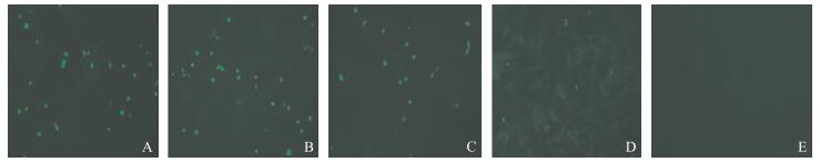 图 3 荧光抗体工作浓度的优化 Figure 3 Optimized the working concentration of VHH by gradient dilution A~D.20、10、5和2.5 μg·mL-1荧光抗体分别孵育感染CSFV的PK15细胞; E.20 μg·mL-1荧光抗体孵育正常PK15细胞 A-D.Incubated PK15 cells which infected CSFV with 20, 10, 5 and 2.5 μg·mL-1VHH respectively; E.Incubated normal PK15 cells with 20 μg·mL-1 VHH |