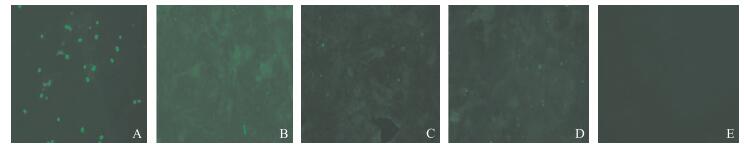 图 4 荧光抗体的特异性检验 Figure 4 Evaluated the specificity of VHH by crossing reaction with other virus A~E.荧光抗体分别接种孵育CSFV、PCV2、PRV、PPV的PK15细胞和正常PK15细胞。 A-E.VHH incubated with PK15 cell which infected CSFV, PCV2, PRV, PPV and normal PK15 cells. |