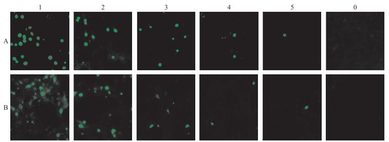 图 5 直接免疫荧光 (A) 与间接免疫荧光 (B) 试验效果比较 Figure 5 The effectiveness comparison between direct immunofluorescence assays (DFA)(A) and indirec immunofluorescence assay (IFA)(B) A1~A5.VHH分别孵育不同浓度梯度 (10-3~10-7) 的CSFV后进行直接免疫荧光; B1~B5.猪瘟单克隆抗体孵育不同浓度梯度 (10-1~10-7) 的CSFV进行间接免疫荧光; A0、B0.不含CSFV的空白对照组。 A1-A5.VHH was incubated with different concentrations (10-3-10-7) of CSFV to develop DFA; B1-B5.Monoclonal antibodies were incubated with different concentrations (10-1-10-7) of CSFV to develop IFA; A0, B0.PK15 cell without CSFV. |
