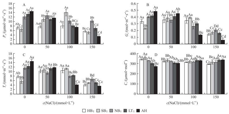 由图 1-A可见:盐胁迫后5个产地菘蓝幼苗的Pn出现不同程度的变化。HB和SB菘蓝幼苗的Pn随着盐浓度的增加呈先上升后下降的趋势, 在100 mmol·L-1 NaCl处理时最高, 而NB、LT及AH菘蓝幼苗的Pn则随着盐浓度的升高而降低。50 mmol·L-1 NaCl的轻度胁迫时, LT和AH菘蓝的Pn分别比对照降低了18.21%和20.18%, 而NB菘蓝的Pn则与对照无显著差异。150 mmol·L-1 NaCl胁迫下, NB、LT和AH菘蓝的Pn显著降低, 分别比对照下降了15.48%、47.93%和76.77%, 与对照间差异达到极显著水平。值的注意的是, 5个产地菘蓝幼苗各对照的Pn表现出较大的差异, 这可能与不同产地间菘蓝自身的遗传差异性有关。