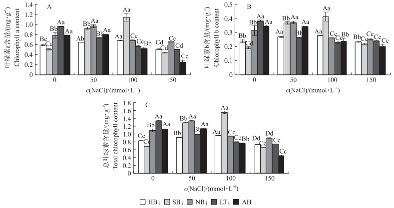 2.3 盐胁迫对菘蓝幼苗叶绿素含量的影响从图 2可见:HB和SB菘蓝幼苗叶片的叶绿素含量均随着盐浓度的升高呈先上升后下降趋势。HB菘蓝叶片的叶绿素含量随着盐浓度的增加而平缓上升, 并在100 mmol·L-1 NaCl胁迫下达到峰值, 其叶绿素a、叶绿素b和总叶绿素含量分别比对照增加了16.00%、16.67%和16.16%, 而在150 mmol·L-1 NaCl胁迫时显著降低。盐胁迫下, SB菘蓝的叶绿素含量变化幅度较大, 除150 mmol·L-1 NaCl处理外的各处理间差异达到极显著水平。NB、LT和AH菘蓝的叶绿素a、叶绿素b和总叶绿素含量随盐胁迫程度的增加整体呈递减的趋势。其中, NB菘蓝的叶绿素a、叶绿素b和总叶绿素含量在50 mmol·L-1 NaCl胁迫时显著升高, 之后开始逐步下降。LT菘蓝各盐浓度处理间叶绿素a含量的差异达到显著水平。150 mmol·L-1 NaCl处理下, AH菘蓝幼苗的叶绿素a、叶绿素b和总叶绿素含量分别比对照降低了68.80%、41.40%和73.27%。说明HB菘蓝对盐的耐受性较强, 盐胁迫对其叶绿素合成的影响不大, NB、LT及AH菘蓝对盐胁迫较为敏感, 适当的盐胁迫反而能够促进SB菘蓝叶绿素的合成。