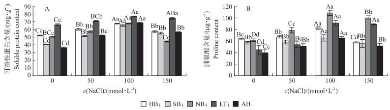 HB和SB的菘蓝幼苗耐盐性较好, 盐胁迫对其体内可溶性蛋白和脯氨酸的积累影响不大, 对NB、LT、AH菘蓝幼苗的渗透胁迫作用则较为明显。