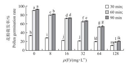 图 1 不同质量浓度氟(F)对茶树花粉萌发率的影响 Figure 1 Effects of different concentrations of fluorine (F)on the pollen germination rate of Camellia sinesis 不同小写字母表示处理间差异显著(P<0.05)。下同。 Different lowercase letters indicate significant difference at 0.05 level in treatments. The same as follows. |