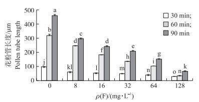 图 2 不同质量浓度氟对茶树花粉管长度的影响 Figure 2 Effects of different concentrations of fluorine on the pollen tube length of Camellia sinensis |