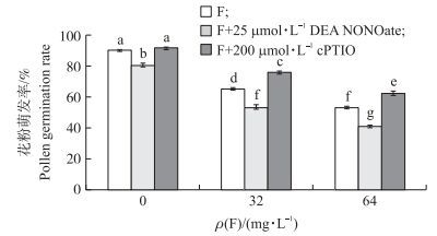 图 3 不同质量浓度氟处理下NO释放剂DEA NONOate和清除剂cPTIO对茶树花粉萌发率的影响 Figure 3 Effects of NO donor DEA NONOate and scavenger cPTIO on the tea pollen germination rate under different concentrations of fluorine treatments |