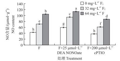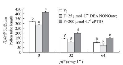 由图 5可见:随着氟处理浓度的增加, 花粉管内的NO含量显著增加。在氟处理中加入25 μmol·L-1DEA NONOate, NO含量显著增加, 而加入200 μmol·L-1 cPTIO, NO含量显著下降。表明氟可以增加茶树花粉管内NO含量。另外, 茶树花粉管在氟处理下, 外施DEA NONOate增加了花粉管内NO的含量, 而cPTIO降低了NO的含量。