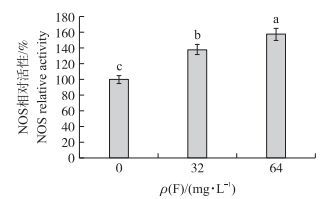 由图 6可见:与对照相比, 32和64 mg·L-1氟处理后, NOS活性分别增加了38.48%和58.04%, 表明随着氟质量浓度的增加花粉管内的NOS活性显著提高。